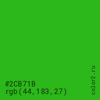 Цвет #2CB71B в цветовой модели RGB обозначается тремя октетами (44, 183, 27) в десятичном формате и #2CB71B в шестнадцатиричном (hex) формате, которые являются интенсивностью красного 44 (hex 2C), интенсивность зелёного 183 (hex B7) и интенсивность синего 27 (hex 1B).