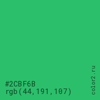 Цвет #2CBF6B в цветовой модели RGB обозначается тремя октетами (44, 191, 107) в десятичном формате и #2CBF6B в шестнадцатиричном (hex) формате, которые являются интенсивностью красного 44 (hex 2C), интенсивность зелёного 191 (hex BF) и интенсивность синего 107 (hex 6B).