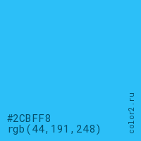 Цвет #2CBFF8 в цветовой модели RGB обозначается тремя октетами (44, 191, 248) в десятичном формате и #2CBFF8 в шестнадцатиричном (hex) формате, которые являются интенсивностью красного 44 (hex 2C), интенсивность зелёного 191 (hex BF) и интенсивность синего 248 (hex F8).