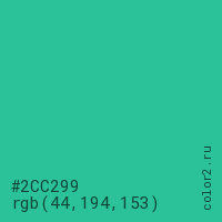 Цвет #2CC299 в цветовой модели RGB обозначается тремя октетами (44, 194, 153) в десятичном формате и #2CC299 в шестнадцатиричном (hex) формате, которые являются интенсивностью красного 44 (hex 2C), интенсивность зелёного 194 (hex C2) и интенсивность синего 153 (hex 99).
