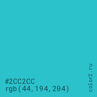 Цвет #2CC2CC в цветовой модели RGB обозначается тремя октетами (44, 194, 204) в десятичном формате и #2CC2CC в шестнадцатиричном (hex) формате, которые являются интенсивностью красного 44 (hex 2C), интенсивность зелёного 194 (hex C2) и интенсивность синего 204 (hex CC).