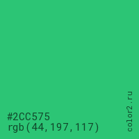 Цвет #2CC575 в цветовой модели RGB обозначается тремя октетами (44, 197, 117) в десятичном формате и #2CC575 в шестнадцатиричном (hex) формате, которые являются интенсивностью красного 44 (hex 2C), интенсивность зелёного 197 (hex C5) и интенсивность синего 117 (hex 75).