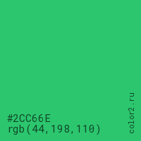 Цвет #2CC66E в цветовой модели RGB обозначается тремя октетами (44, 198, 110) в десятичном формате и #2CC66E в шестнадцатиричном (hex) формате, которые являются интенсивностью красного 44 (hex 2C), интенсивность зелёного 198 (hex C6) и интенсивность синего 110 (hex 6E).