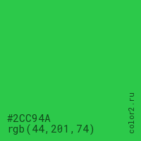 Цвет #2CC94A в цветовой модели RGB обозначается тремя октетами (44, 201, 74) в десятичном формате и #2CC94A в шестнадцатиричном (hex) формате, которые являются интенсивностью красного 44 (hex 2C), интенсивность зелёного 201 (hex C9) и интенсивность синего 74 (hex 4A).