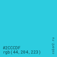 Цвет #2CCCDF в цветовой модели RGB обозначается тремя октетами (44, 204, 223) в десятичном формате и #2CCCDF в шестнадцатиричном (hex) формате, которые являются интенсивностью красного 44 (hex 2C), интенсивность зелёного 204 (hex CC) и интенсивность синего 223 (hex DF).