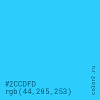 Цвет #2CCDFD в цветовой модели RGB обозначается тремя октетами (44, 205, 253) в десятичном формате и #2CCDFD в шестнадцатиричном (hex) формате, которые являются интенсивностью красного 44 (hex 2C), интенсивность зелёного 205 (hex CD) и интенсивность синего 253 (hex FD).