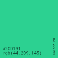 Цвет #2CD191 в цветовой модели RGB обозначается тремя октетами (44, 209, 145) в десятичном формате и #2CD191 в шестнадцатиричном (hex) формате, которые являются интенсивностью красного 44 (hex 2C), интенсивность зелёного 209 (hex D1) и интенсивность синего 145 (hex 91).