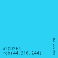 Цвет #2CD2F4 в цветовой модели RGB обозначается тремя октетами (44, 210, 244) в десятичном формате и #2CD2F4 в шестнадцатиричном (hex) формате, которые являются интенсивностью красного 44 (hex 2C), интенсивность зелёного 210 (hex D2) и интенсивность синего 244 (hex F4).