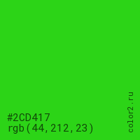 Цвет #2CD417 в цветовой модели RGB обозначается тремя октетами (44, 212, 23) в десятичном формате и #2CD417 в шестнадцатиричном (hex) формате, которые являются интенсивностью красного 44 (hex 2C), интенсивность зелёного 212 (hex D4) и интенсивность синего 23 (hex 17).