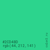 Цвет #2CD48D в цветовой модели RGB обозначается тремя октетами (44, 212, 141) в десятичном формате и #2CD48D в шестнадцатиричном (hex) формате, которые являются интенсивностью красного 44 (hex 2C), интенсивность зелёного 212 (hex D4) и интенсивность синего 141 (hex 8D).