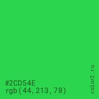 Цвет #2CD54E в цветовой модели RGB обозначается тремя октетами (44, 213, 78) в десятичном формате и #2CD54E в шестнадцатиричном (hex) формате, которые являются интенсивностью красного 44 (hex 2C), интенсивность зелёного 213 (hex D5) и интенсивность синего 78 (hex 4E).