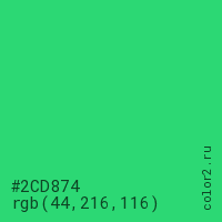 Цвет #2CD874 в цветовой модели RGB обозначается тремя октетами (44, 216, 116) в десятичном формате и #2CD874 в шестнадцатиричном (hex) формате, которые являются интенсивностью красного 44 (hex 2C), интенсивность зелёного 216 (hex D8) и интенсивность синего 116 (hex 74).