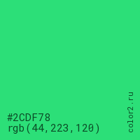 Цвет RGB(44, 223, 120) в процентом отношении количества цвета состоит из 17.3% красного (red), 87.5% зелёного (green) и 47.1% синего (blue).