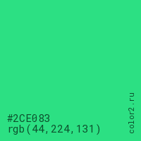 Цвет #2CE083 в цветовой модели RGB обозначается тремя октетами (44, 224, 131) в десятичном формате и #2CE083 в шестнадцатиричном (hex) формате, которые являются интенсивностью красного 44 (hex 2C), интенсивность зелёного 224 (hex E0) и интенсивность синего 131 (hex 83).