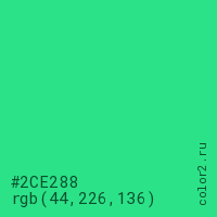 Цвет #2CE288 в цветовой модели RGB обозначается тремя октетами (44, 226, 136) в десятичном формате и #2CE288 в шестнадцатиричном (hex) формате, которые являются интенсивностью красного 44 (hex 2C), интенсивность зелёного 226 (hex E2) и интенсивность синего 136 (hex 88).