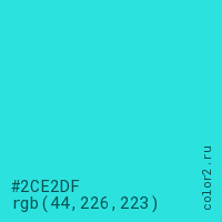 Цвет #2CE2DF в цветовой модели RGB обозначается тремя октетами (44, 226, 223) в десятичном формате и #2CE2DF в шестнадцатиричном (hex) формате, которые являются интенсивностью красного 44 (hex 2C), интенсивность зелёного 226 (hex E2) и интенсивность синего 223 (hex DF).