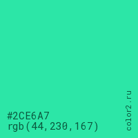 Цвет #2CE6A7 в цветовой модели RGB обозначается тремя октетами (44, 230, 167) в десятичном формате и #2CE6A7 в шестнадцатиричном (hex) формате, которые являются интенсивностью красного 44 (hex 2C), интенсивность зелёного 230 (hex E6) и интенсивность синего 167 (hex A7).
