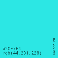 Цвет #2CE7E4 в цветовой модели RGB обозначается тремя октетами (44, 231, 228) в десятичном формате и #2CE7E4 в шестнадцатиричном (hex) формате, которые являются интенсивностью красного 44 (hex 2C), интенсивность зелёного 231 (hex E7) и интенсивность синего 228 (hex E4).