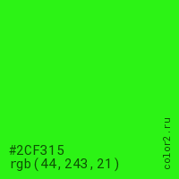 Цвет #2CF315 в цветовой модели RGB обозначается тремя октетами (44, 243, 21) в десятичном формате и #2CF315 в шестнадцатиричном (hex) формате, которые являются интенсивностью красного 44 (hex 2C), интенсивность зелёного 243 (hex F3) и интенсивность синего 21 (hex 15).