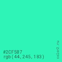 Цвет #2CF5B7 в цветовой модели RGB обозначается тремя октетами (44, 245, 183) в десятичном формате и #2CF5B7 в шестнадцатиричном (hex) формате, которые являются интенсивностью красного 44 (hex 2C), интенсивность зелёного 245 (hex F5) и интенсивность синего 183 (hex B7).
