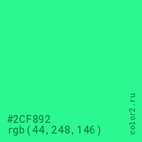 Цвет #2CF892 в цветовой модели RGB обозначается тремя октетами (44, 248, 146) в десятичном формате и #2CF892 в шестнадцатиричном (hex) формате, которые являются интенсивностью красного 44 (hex 2C), интенсивность зелёного 248 (hex F8) и интенсивность синего 146 (hex 92).
