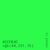 Цвет #2CFB4C в цветовой модели RGB обозначается тремя октетами (44, 251, 76) в десятичном формате и #2CFB4C в шестнадцатиричном (hex) формате, которые являются интенсивностью красного 44 (hex 2C), интенсивность зелёного 251 (hex FB) и интенсивность синего 76 (hex 4C).