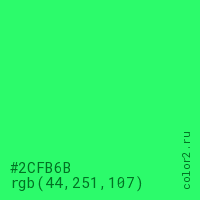 Цвет #2CFB6B в цветовой модели RGB обозначается тремя октетами (44, 251, 107) в десятичном формате и #2CFB6B в шестнадцатиричном (hex) формате, которые являются интенсивностью красного 44 (hex 2C), интенсивность зелёного 251 (hex FB) и интенсивность синего 107 (hex 6B).