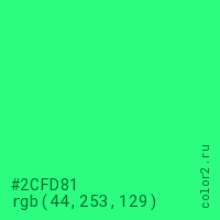 Цвет #2CFD81 в цветовой модели RGB обозначается тремя октетами (44, 253, 129) в десятичном формате и #2CFD81 в шестнадцатиричном (hex) формате, которые являются интенсивностью красного 44 (hex 2C), интенсивность зелёного 253 (hex FD) и интенсивность синего 129 (hex 81).