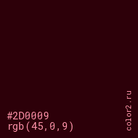 Цвет #2D0009 в цветовой модели RGB обозначается тремя октетами (45, 0, 9) в десятичном формате и #2D0009 в шестнадцатиричном (hex) формате, которые являются интенсивностью красного 45 (hex 2D), интенсивность зелёного 0 (hex 00) и интенсивность синего 9 (hex 09).
