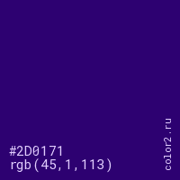 Цвет #2D0171 в цветовой модели RGB обозначается тремя октетами (45, 1, 113) в десятичном формате и #2D0171 в шестнадцатиричном (hex) формате, которые являются интенсивностью красного 45 (hex 2D), интенсивность зелёного 1 (hex 01) и интенсивность синего 113 (hex 71).