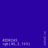 Цвет #2D02A5 в цветовой модели RGB обозначается тремя октетами (45, 2, 165) в десятичном формате и #2D02A5 в шестнадцатиричном (hex) формате, которые являются интенсивностью красного 45 (hex 2D), интенсивность зелёного 2 (hex 02) и интенсивность синего 165 (hex A5).