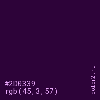 Цвет #2D0339 в цветовой модели RGB обозначается тремя октетами (45, 3, 57) в десятичном формате и #2D0339 в шестнадцатиричном (hex) формате, которые являются интенсивностью красного 45 (hex 2D), интенсивность зелёного 3 (hex 03) и интенсивность синего 57 (hex 39).