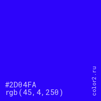 Цвет #2D04FA в цветовой модели RGB обозначается тремя октетами (45, 4, 250) в десятичном формате и #2D04FA в шестнадцатиричном (hex) формате, которые являются интенсивностью красного 45 (hex 2D), интенсивность зелёного 4 (hex 04) и интенсивность синего 250 (hex FA).