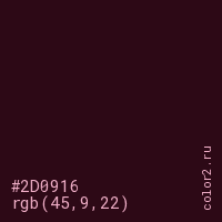 Цвет #2D0916 в цветовой модели RGB обозначается тремя октетами (45, 9, 22) в десятичном формате и #2D0916 в шестнадцатиричном (hex) формате, которые являются интенсивностью красного 45 (hex 2D), интенсивность зелёного 9 (hex 09) и интенсивность синего 22 (hex 16).