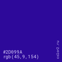 Цвет #2D099A в цветовой модели RGB обозначается тремя октетами (45, 9, 154) в десятичном формате и #2D099A в шестнадцатиричном (hex) формате, которые являются интенсивностью красного 45 (hex 2D), интенсивность зелёного 9 (hex 09) и интенсивность синего 154 (hex 9A).