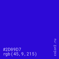 Цвет #2D09D7 в цветовой модели RGB обозначается тремя октетами (45, 9, 215) в десятичном формате и #2D09D7 в шестнадцатиричном (hex) формате, которые являются интенсивностью красного 45 (hex 2D), интенсивность зелёного 9 (hex 09) и интенсивность синего 215 (hex D7).