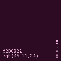 Цвет #2D0B22 в цветовой модели RGB обозначается тремя октетами (45, 11, 34) в десятичном формате и #2D0B22 в шестнадцатиричном (hex) формате, которые являются интенсивностью красного 45 (hex 2D), интенсивность зелёного 11 (hex 0B) и интенсивность синего 34 (hex 22).