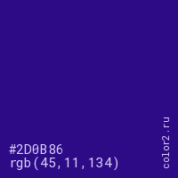 Цвет #2D0B86 в цветовой модели RGB обозначается тремя октетами (45, 11, 134) в десятичном формате и #2D0B86 в шестнадцатиричном (hex) формате, которые являются интенсивностью красного 45 (hex 2D), интенсивность зелёного 11 (hex 0B) и интенсивность синего 134 (hex 86).