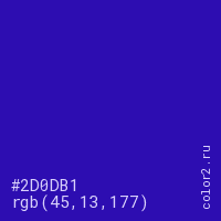 Цвет #2D0DB1 в цветовой модели RGB обозначается тремя октетами (45, 13, 177) в десятичном формате и #2D0DB1 в шестнадцатиричном (hex) формате, которые являются интенсивностью красного 45 (hex 2D), интенсивность зелёного 13 (hex 0D) и интенсивность синего 177 (hex B1).