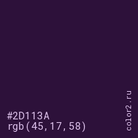 Цвет #2D113A в цветовой модели RGB обозначается тремя октетами (45, 17, 58) в десятичном формате и #2D113A в шестнадцатиричном (hex) формате, которые являются интенсивностью красного 45 (hex 2D), интенсивность зелёного 17 (hex 11) и интенсивность синего 58 (hex 3A).