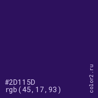 Цвет #2D115D в цветовой модели RGB обозначается тремя октетами (45, 17, 93) в десятичном формате и #2D115D в шестнадцатиричном (hex) формате, которые являются интенсивностью красного 45 (hex 2D), интенсивность зелёного 17 (hex 11) и интенсивность синего 93 (hex 5D).