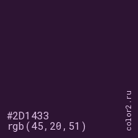 Цвет #2D1433 в цветовой модели RGB обозначается тремя октетами (45, 20, 51) в десятичном формате и #2D1433 в шестнадцатиричном (hex) формате, которые являются интенсивностью красного 45 (hex 2D), интенсивность зелёного 20 (hex 14) и интенсивность синего 51 (hex 33).