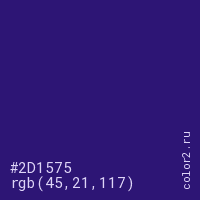 Цвет #2D1575 в цветовой модели RGB обозначается тремя октетами (45, 21, 117) в десятичном формате и #2D1575 в шестнадцатиричном (hex) формате, которые являются интенсивностью красного 45 (hex 2D), интенсивность зелёного 21 (hex 15) и интенсивность синего 117 (hex 75).