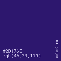 Цвет #2D176E в цветовой модели RGB обозначается тремя октетами (45, 23, 110) в десятичном формате и #2D176E в шестнадцатиричном (hex) формате, которые являются интенсивностью красного 45 (hex 2D), интенсивность зелёного 23 (hex 17) и интенсивность синего 110 (hex 6E).