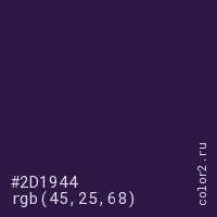 Цвет #2D1944 в цветовой модели RGB обозначается тремя октетами (45, 25, 68) в десятичном формате и #2D1944 в шестнадцатиричном (hex) формате, которые являются интенсивностью красного 45 (hex 2D), интенсивность зелёного 25 (hex 19) и интенсивность синего 68 (hex 44).