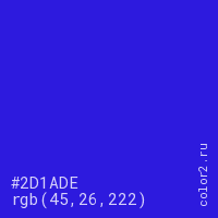Цвет #2D1ADE в цветовой модели RGB обозначается тремя октетами (45, 26, 222) в десятичном формате и #2D1ADE в шестнадцатиричном (hex) формате, которые являются интенсивностью красного 45 (hex 2D), интенсивность зелёного 26 (hex 1A) и интенсивность синего 222 (hex DE).