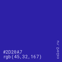 Цвет #2D20A7 в цветовой модели RGB обозначается тремя октетами (45, 32, 167) в десятичном формате и #2D20A7 в шестнадцатиричном (hex) формате, которые являются интенсивностью красного 45 (hex 2D), интенсивность зелёного 32 (hex 20) и интенсивность синего 167 (hex A7).