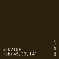Цвет #2D210E в цветовой модели RGB обозначается тремя октетами (45, 33, 14) в десятичном формате и #2D210E в шестнадцатиричном (hex) формате, которые являются интенсивностью красного 45 (hex 2D), интенсивность зелёного 33 (hex 21) и интенсивность синего 14 (hex 0E).