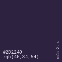 Цвет #2D2240 в цветовой модели RGB обозначается тремя октетами (45, 34, 64) в десятичном формате и #2D2240 в шестнадцатиричном (hex) формате, которые являются интенсивностью красного 45 (hex 2D), интенсивность зелёного 34 (hex 22) и интенсивность синего 64 (hex 40).