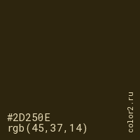 Цвет #2D250E в цветовой модели RGB обозначается тремя октетами (45, 37, 14) в десятичном формате и #2D250E в шестнадцатиричном (hex) формате, которые являются интенсивностью красного 45 (hex 2D), интенсивность зелёного 37 (hex 25) и интенсивность синего 14 (hex 0E).